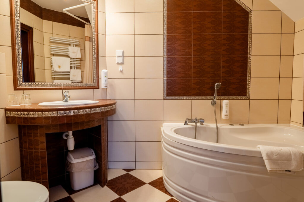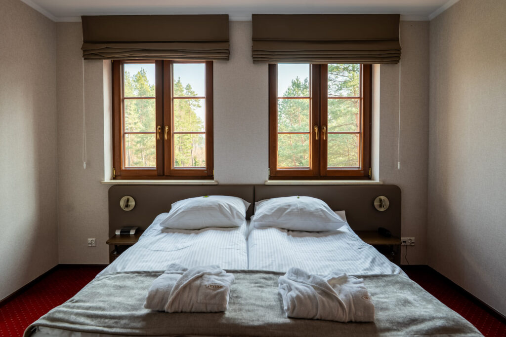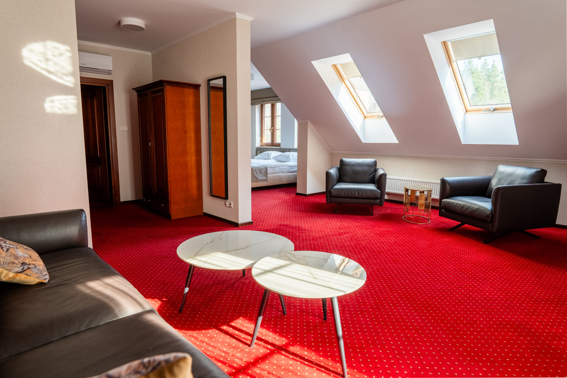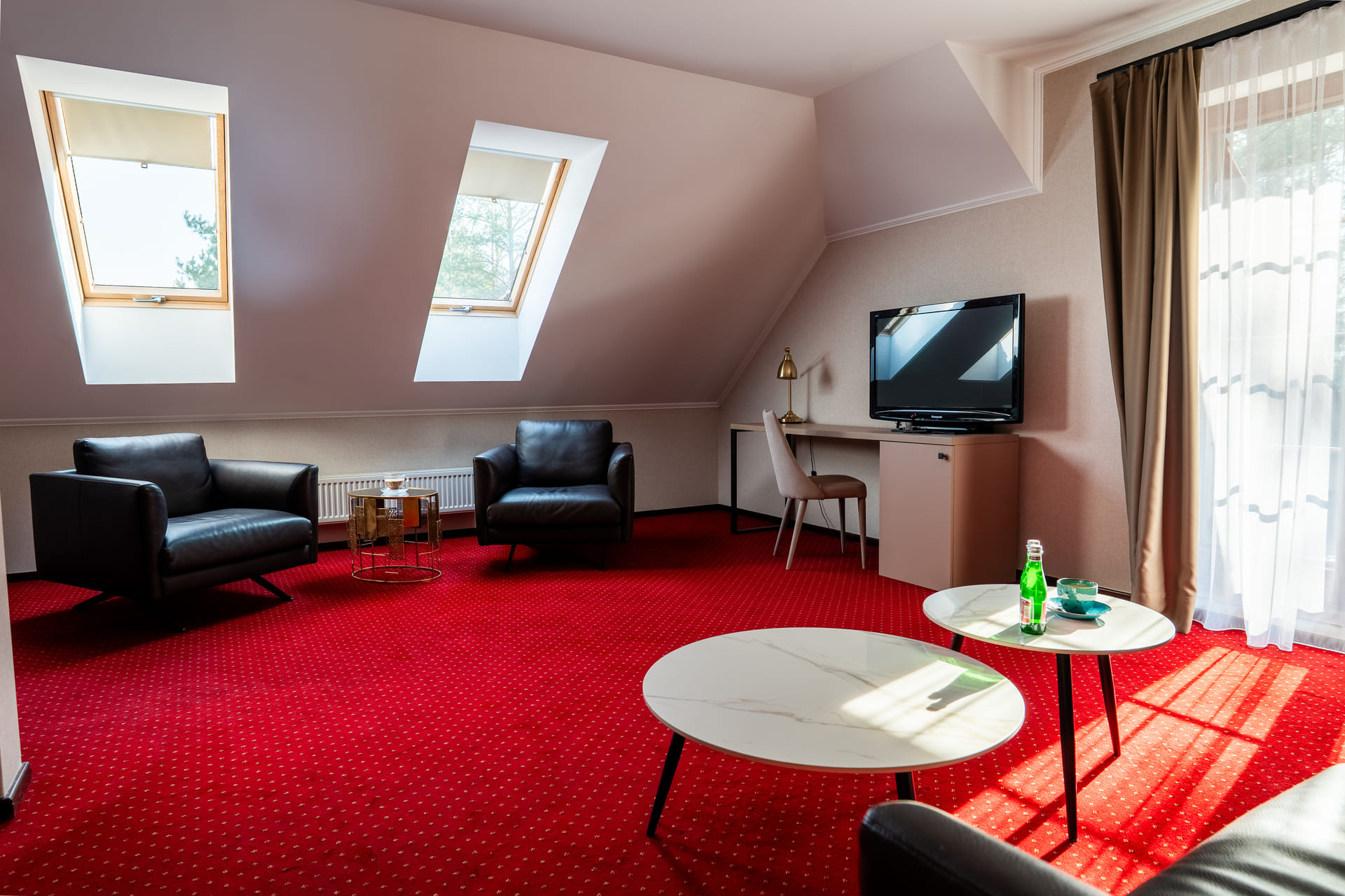 Wyjątkowy, komfortowy w neoklasycystycznymstylu apartament o powierzchni 50 m2 z wygodnym łóżkiem typu king size oraz dwiema łazienkami (jedna z wanną, druga z prysznicem) z miejscem wypoczynkowym, kanapą i stolikami. Pokój posiada piękny widok na las, przestronny taras, biurko umożliwiające pracę przy komputerze, zestaw do parzenia kawy i herbaty, lodówkę oraz sejf. W cenie pobytu wliczone jest śniadanie, dostęp do saun (sauna infrared, sauna sucha), siłowni, sali bilardowej oraz bezpłatnego parkingu.