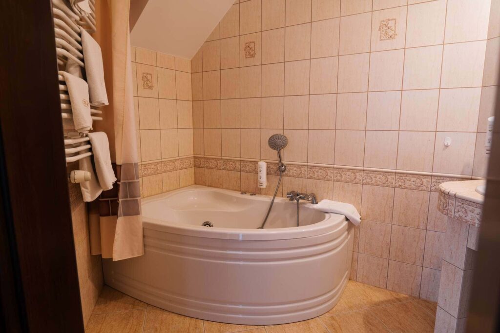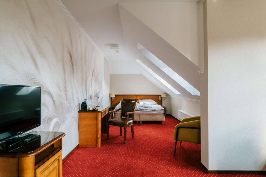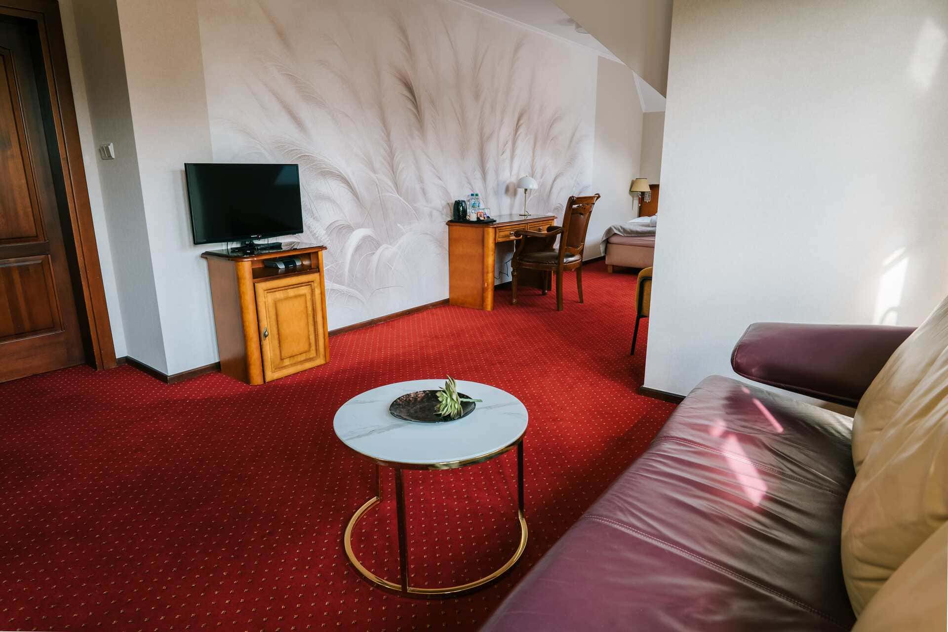 Stylowy apartament z przestrzenią wypoczynkową, z kanapą i stolikiem, z łazienką wyposażoną w wannę oraz wygodnym łóżkiem typu king size. Pięknym widokiem na las, biurkiem umożliwającym pracę przy komputerze, zestawem do parzenia kawy i herbaty oraz lodówką i sejfem. W cenie pobytu wliczone jest śniadanie, dostęp do saun (sauna infrared, sauna sucha), siłowni, sali bilardowej oraz bezpłatnego parkingu.