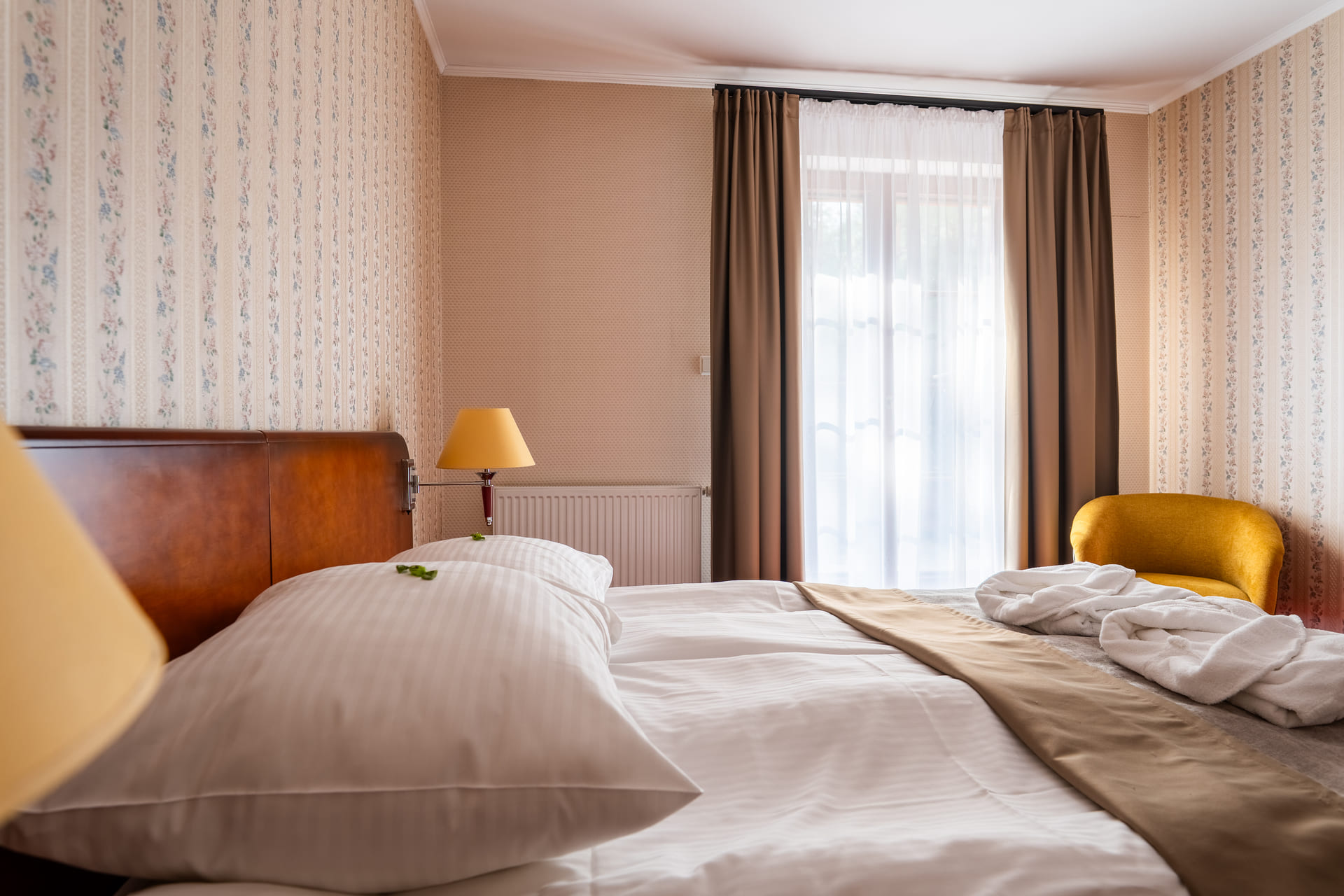 Pokój Deluxe 1 osobowy z tarasem i pięknym widokiem na las oraz wygodnym łóżkiem typu queen size, elegancką łazienką i praktycznym biurkiem umożliwiającym pracę przy komputerze, szybkie Wi-Fi oraz fotel. Do dyspozycji pozostaje również czajnik elektryczny, zestaw do parzenia kawy i herbaty oraz woda mineralna. W cenie pobytu wliczone jest śniadanie, dostęp do saun (sauna infrared, sauna sucha), siłowni, sali bilardowej oraz bezpłatnego parkingu.