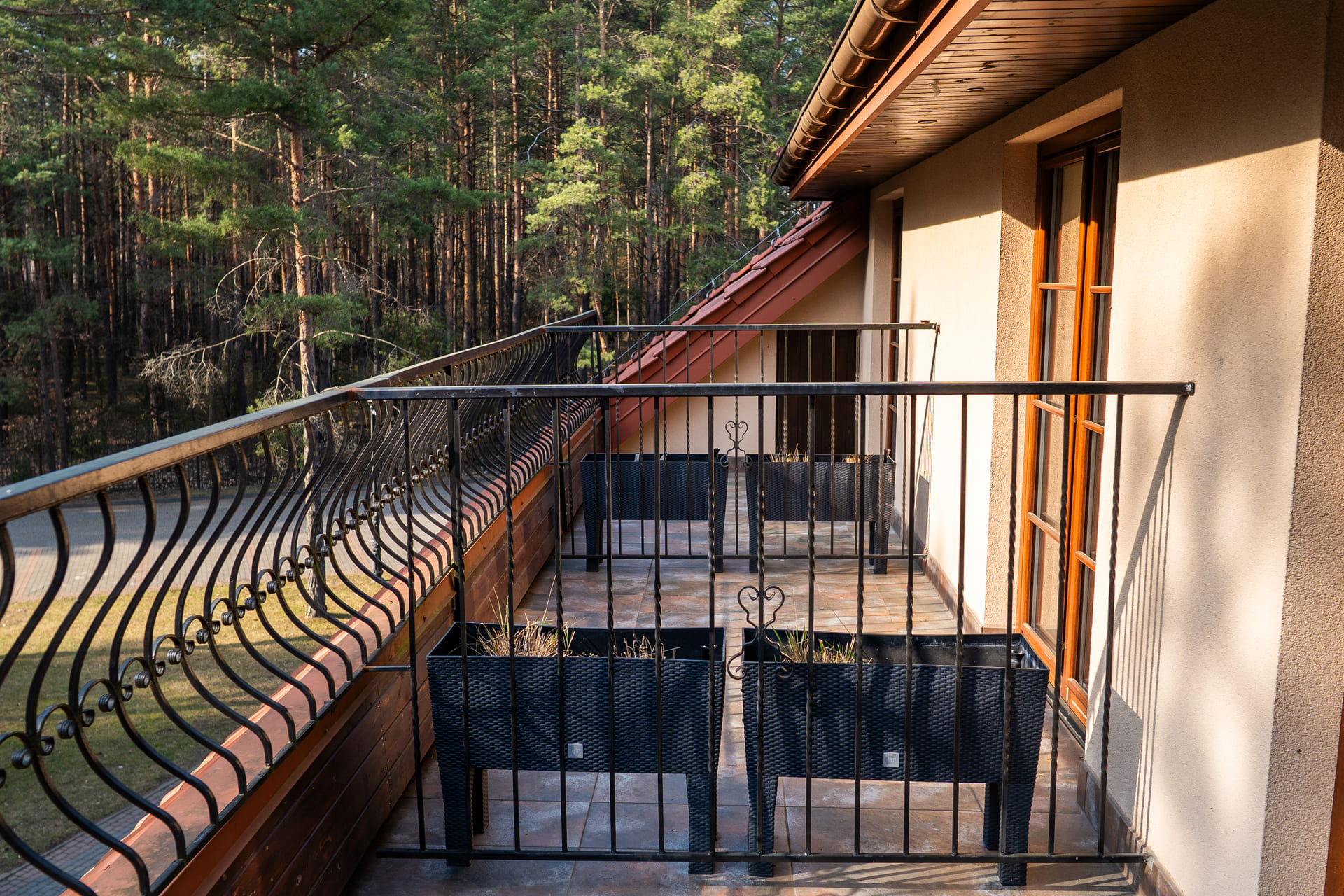 Pokój Deluxe 2 osobowy z tarasem i pięknym widokiem na las oraz wygodnym łóżkiem typu queen size. Wszystkie pokoje tej kategorii posiadają taras, elegancką łazienkę z prysznicem, praktyczne biurko umożliwiające pracę przy komputerze, szybkie Wi-fi oraz fotel. Do dyspozycji pozostaje również czajnik elektryczny, zestaw do parzenia kawy i herbaty oraz woda mineralna. W cenie pobytu wliczone jest śniadanie, dostęp do saun (sauna infrared, sauna sucha), siłowni, sali bilardowej oraz bezpłatnego parkingu.