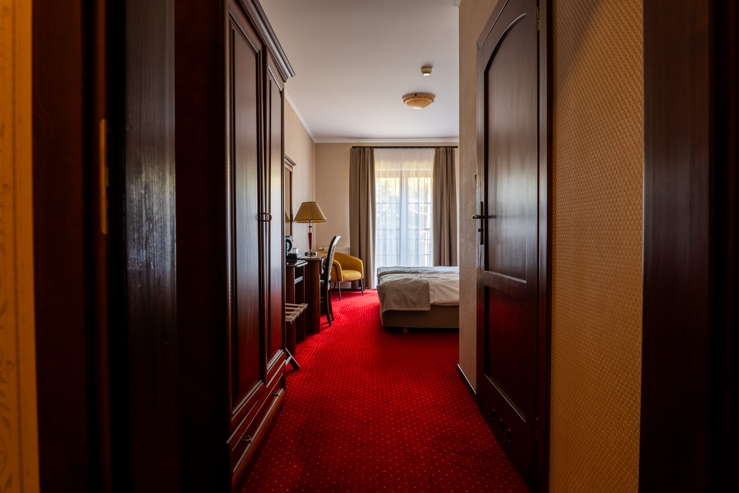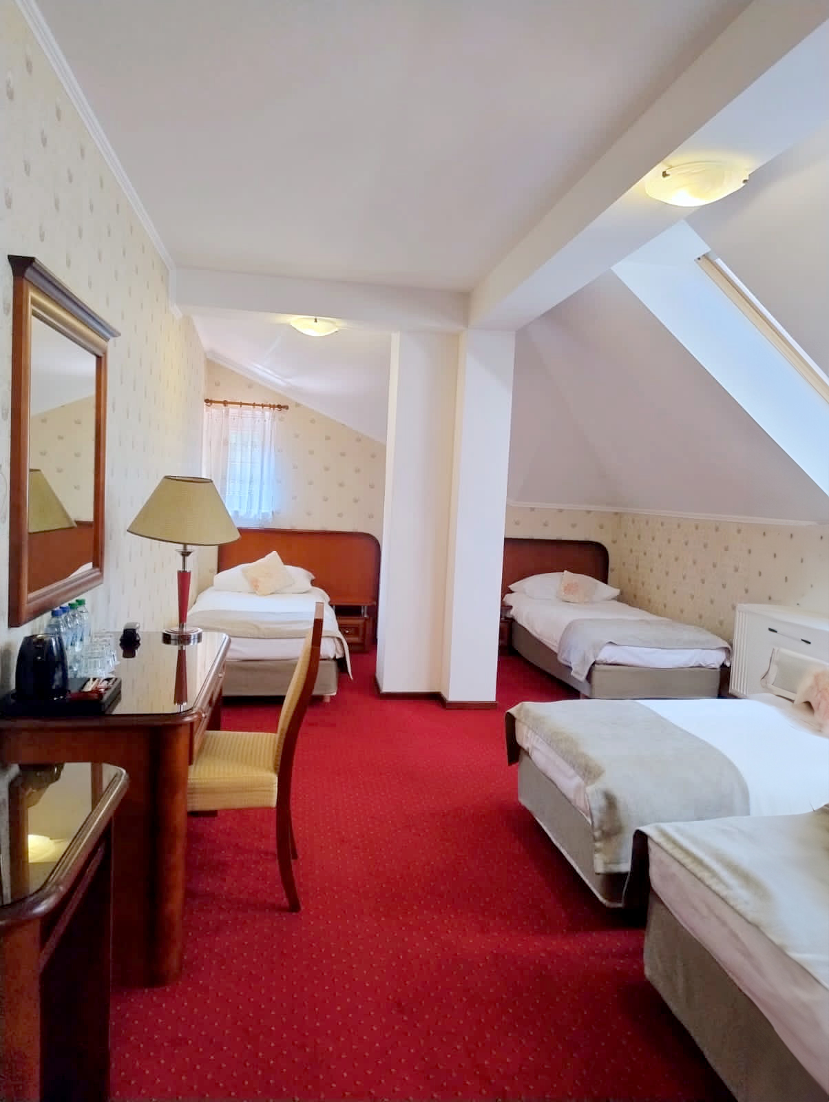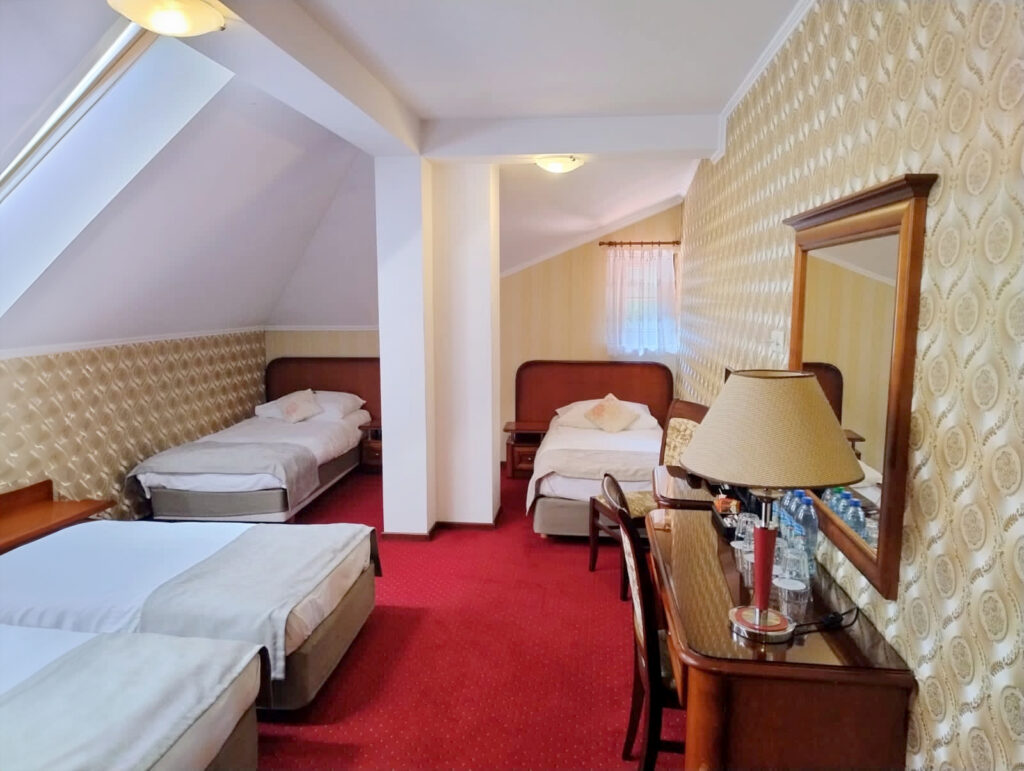 Pokój rodzinny to idealny wybór dla osób podróżujących w większym gronie. Przestronny, dwudziesto siedmio metrowy pokój z elegancką łazienką i wygodnymi łóżkami oraz biurkiem umożliwiającym pracę przy komputerze. Do dyspozycji pozostaje również czajnik elektryczny, zestaw do parzenia kawy i herbaty oraz woda mineralna. W cenie pobytu wliczone jest śniadanie, dostęp do saun (sauna infrared, sauna sucha), siłowni, sali bilardowej oraz bezpłatnego parkingu.
